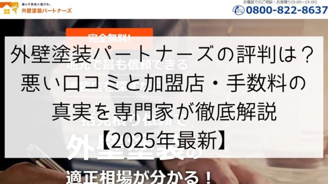 外壁塗装業者紹介サイト 外壁塗装パートナーズの評判は?悪い口コミと加盟店・手数料の真実を専門家が徹底解説【2025年最新】 2021年8月15日 kentaro https://reform-site.net/wp-content/uploads/2021/01/4-e1610850539831.png リフォームのマニュアル
