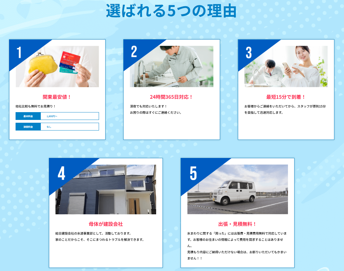 | 技術力・安心感 | 水道局指定工事店の確かな技術力。最大10年保証。 | 厳しい審査基準をクリアした優良業者のみを紹介。悪徳業者に当たるリスクを回避。 |