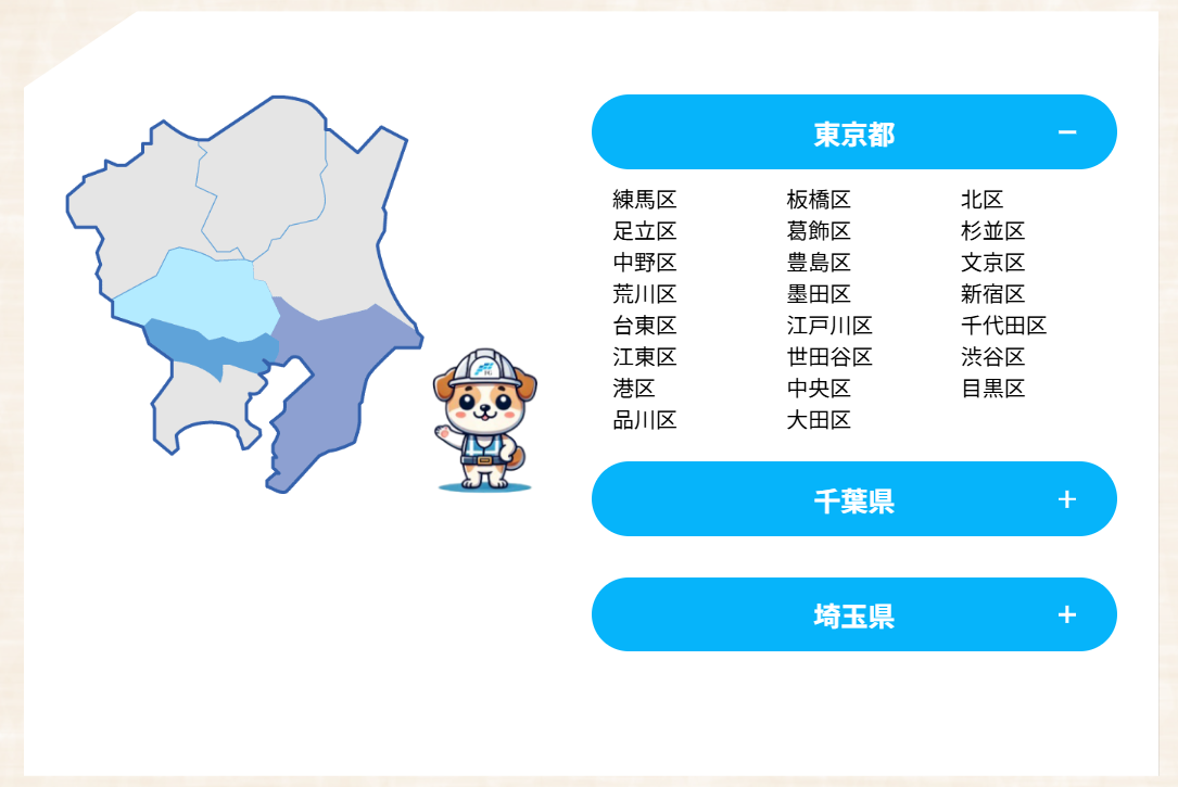フジスイのサービスエリアは東京・千葉・埼玉全域をカバーしています。一部離島や山間部を除き、ほぼ全域で対応可能です。