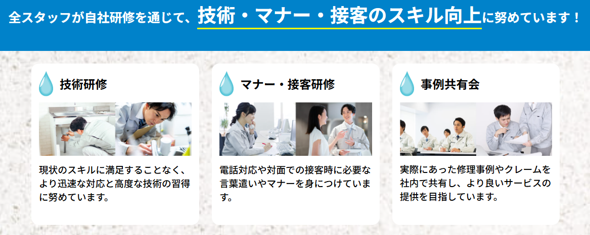 他社との差別化ポイントを詳しく見ていきましょう。フジスイの強みは単なる修理技術だけでなく、総合的なサービス品質の高さにあります。