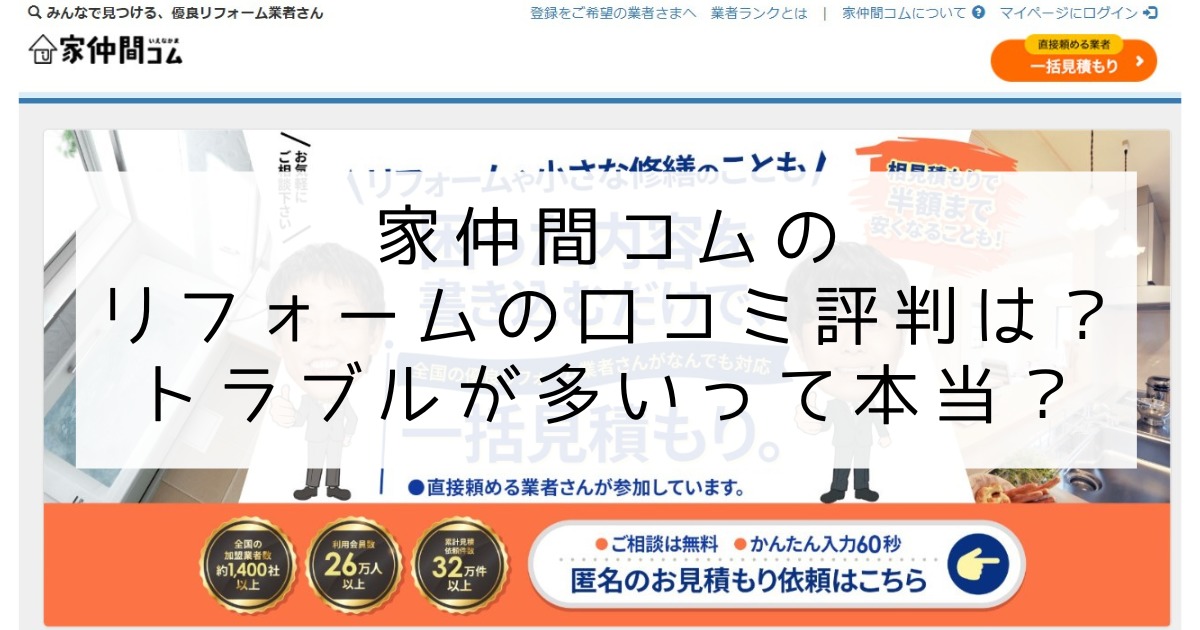 家仲間コムは年間30万人以上が利用する国内最大級のリフォーム業者マッチングサイトですが、実際の口コミ評判やトラブル事例について気になる方も多いでしょう。