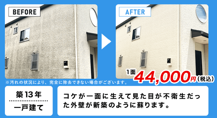 基本料金は1面44,000円から、戸建住宅全体でも17万円台と、外壁塗装の10分の1以下のコストで済みます。