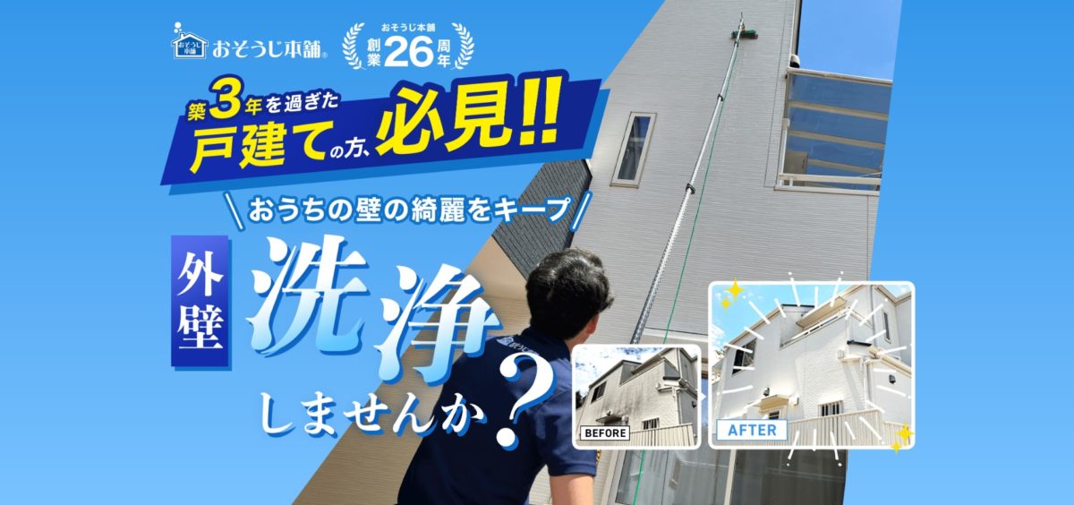 おそうじ本舗の外壁手洗い洗浄サービスは、足場不要で外壁を新築のような美しさに復元できる画期的なサービスです。