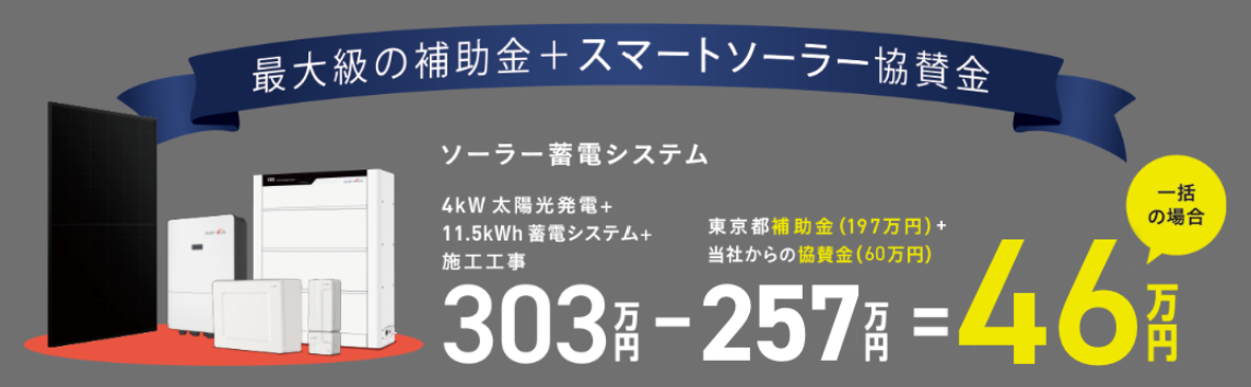 東京都と国の補助金に加えて、スマートソーラー自身も自社協賛金として数十万円を負担してくれます。これは期間限定のキャンペーンであり、メーカー直販だからこそ実現できる価格還元策です。