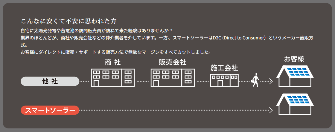 スマートソーラーの最大の特徴は、業界でも非常に希少な「メーカー直販体制」です。この仕組みがどのように価格競争力につながっているのか、詳しく解説します。