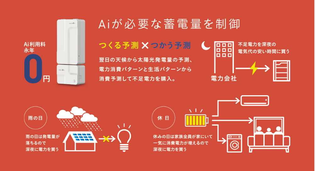 スマートソーラーの蓄電池には、AI制御機能が搭載されています。天気予報データをもとに翌日の発電量を予測し、最適なタイミングで充放電を自動調整してくれます。