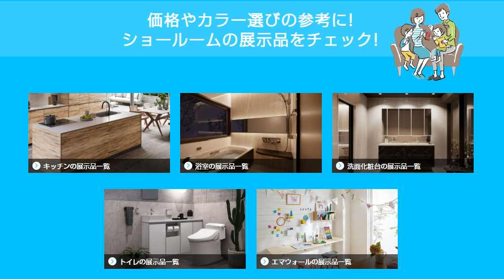 | LIXIL | 家全体の設備を総合展示 | 人造大理石、樹脂素材 | 多彩な価格とグレード設定 |