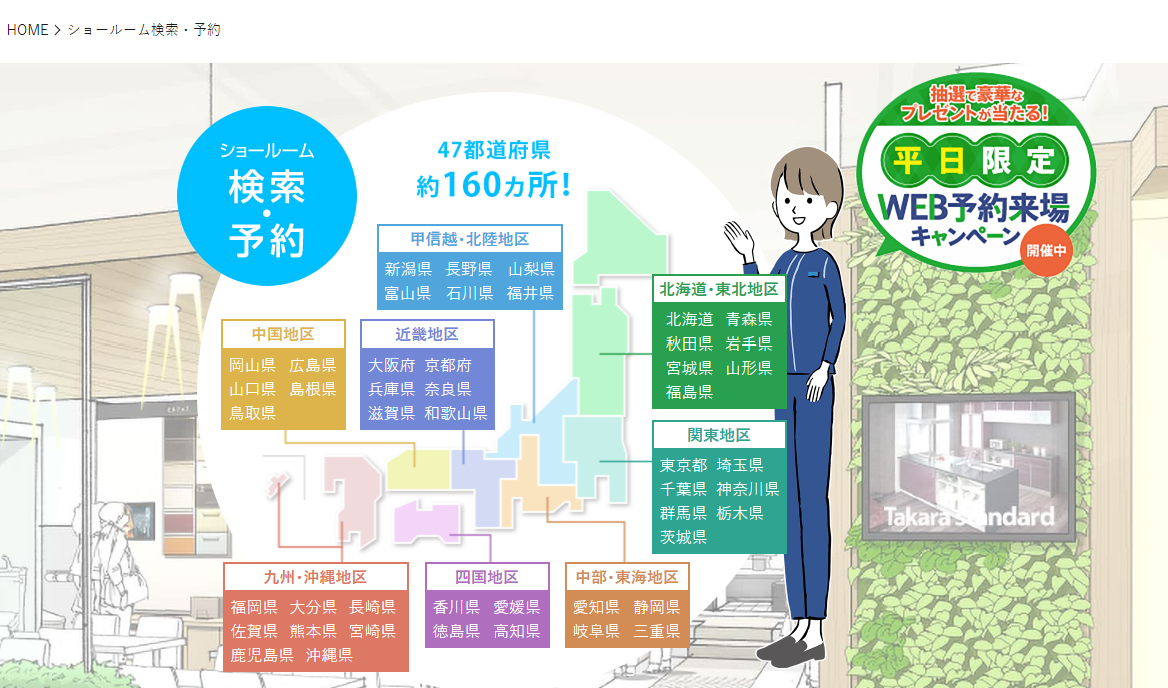 - 公式サイトにアクセス タカラスタンダード公式サイトの「ショールーム検索・予約」ページから、全国各地のショールーム一覧を確認します。
